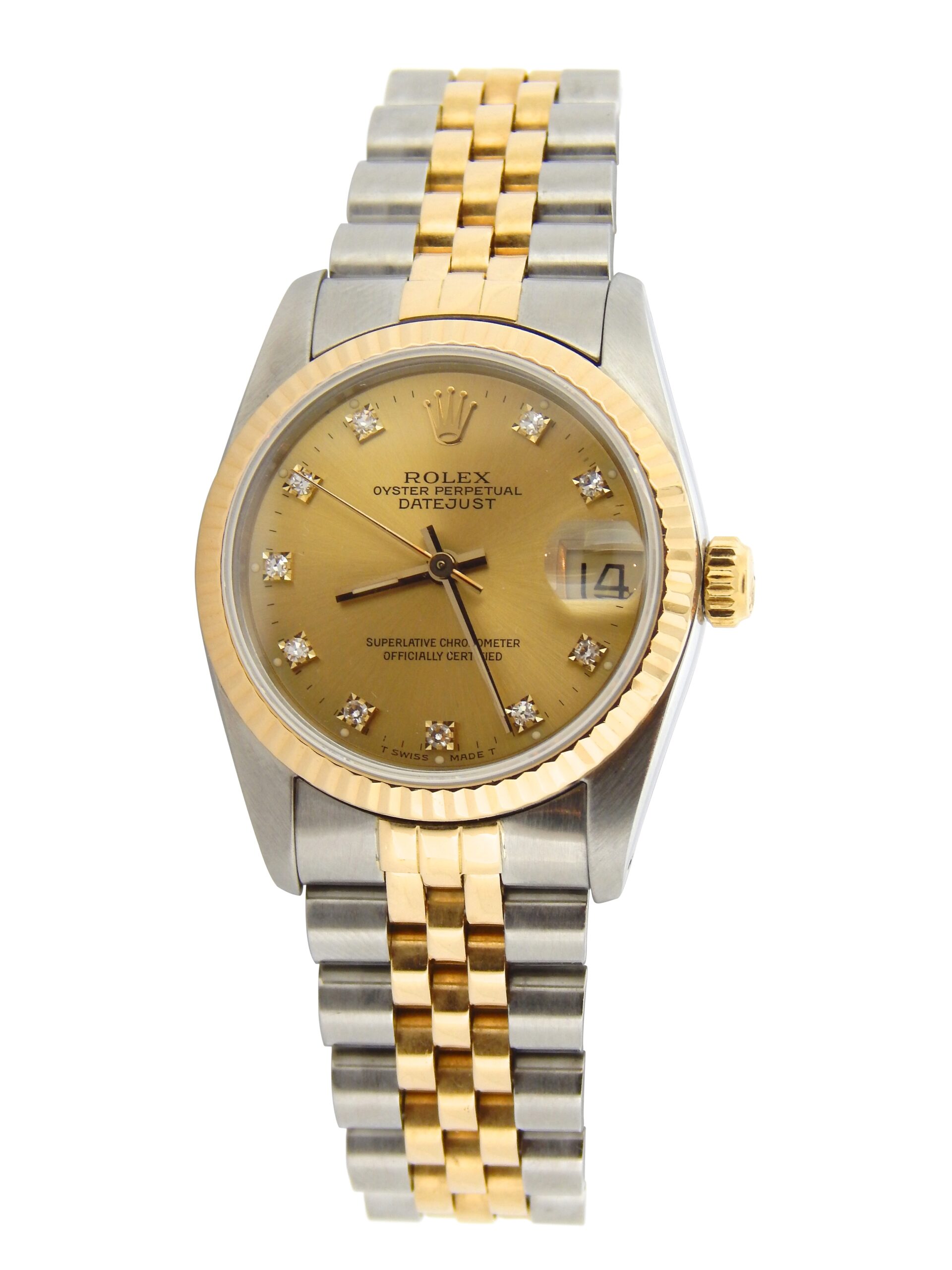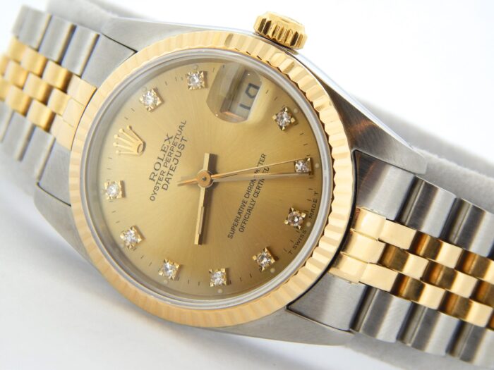 Rolex GOLD CHAMPAGNE dial with 10 round brilliant diamonds. This is a factory original diamond dial that is produced by Rolex. |