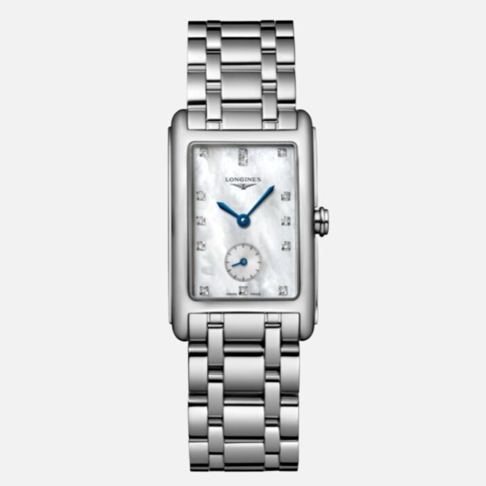The Longines DolceVita features a sleek stainless steel case, measuring 23 mm in diameter, meticulously crafted to perfection. Its mother-of-pearl dial adds a touch of luminous beauty, complemented by shimmering diamond markers that catch the light with every movement.