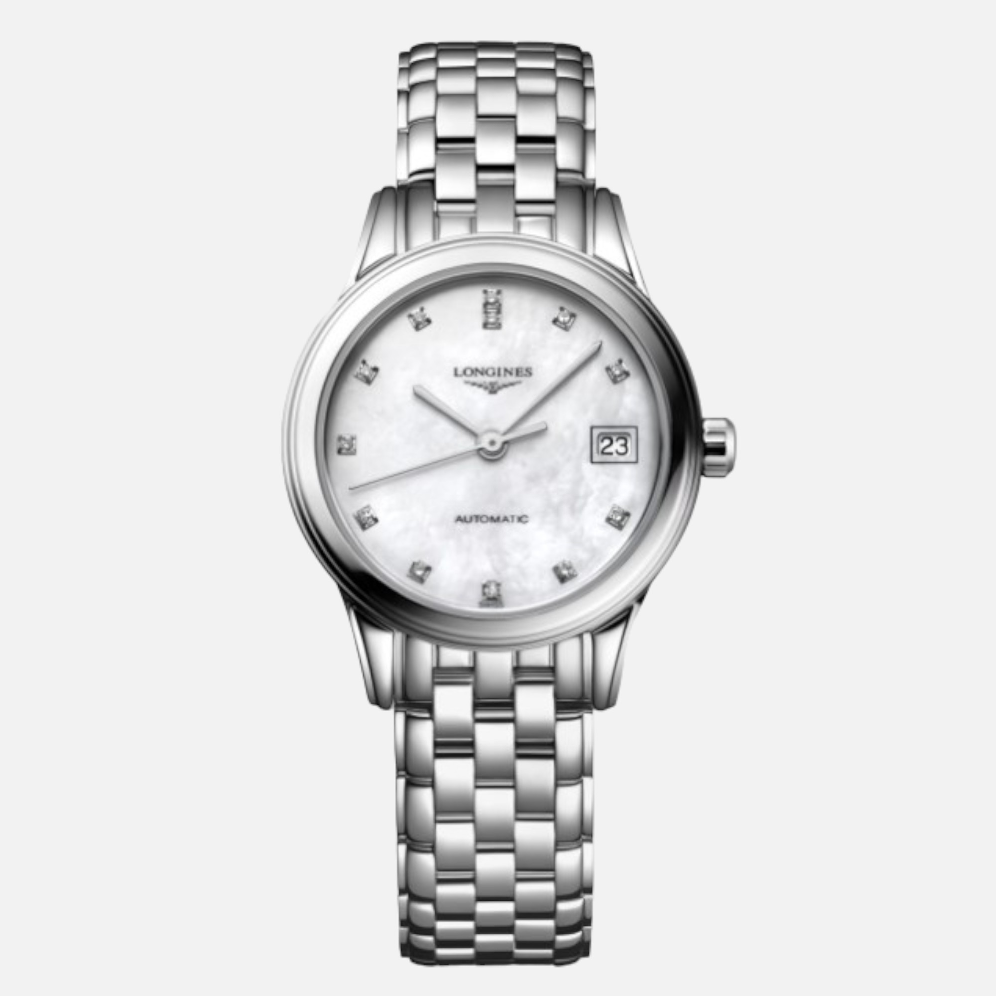Explore the Longines Flagship L4.274.4.87.6, featuring a 33 mm stainless steel case, mother of pearl dial with diamond markers, and a stainless steel bracelet. Embrace timeless elegance and superior craftsmanship.