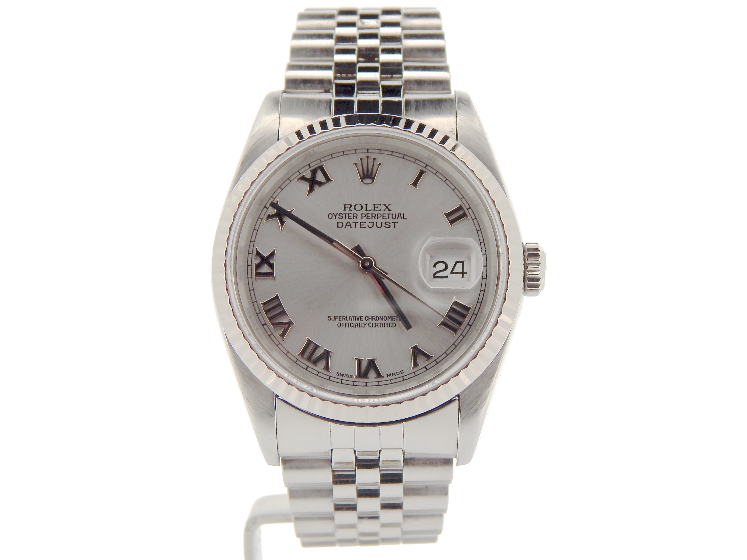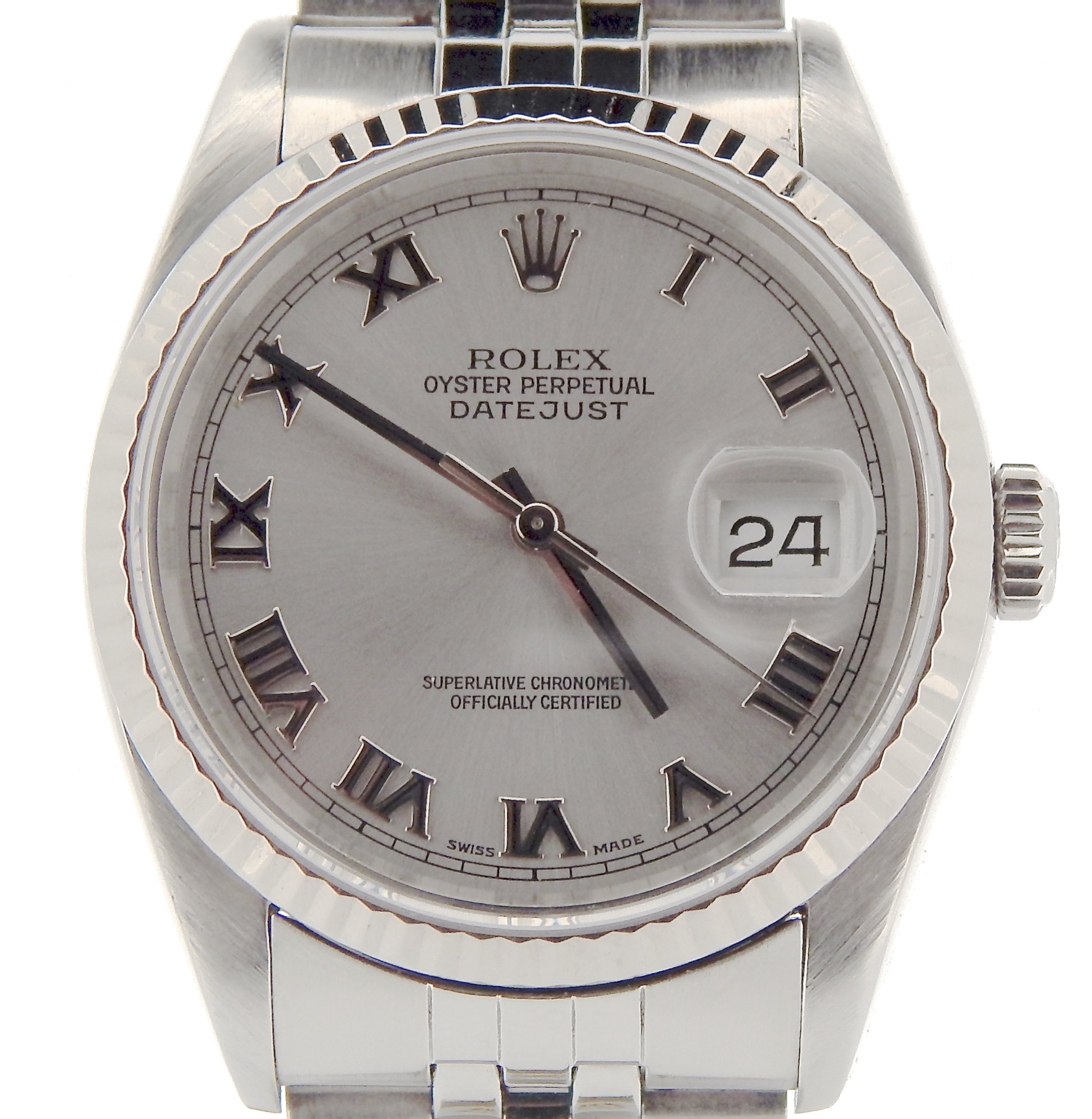 Rolex SILVER dial with raised ROMAN numeral markers. |