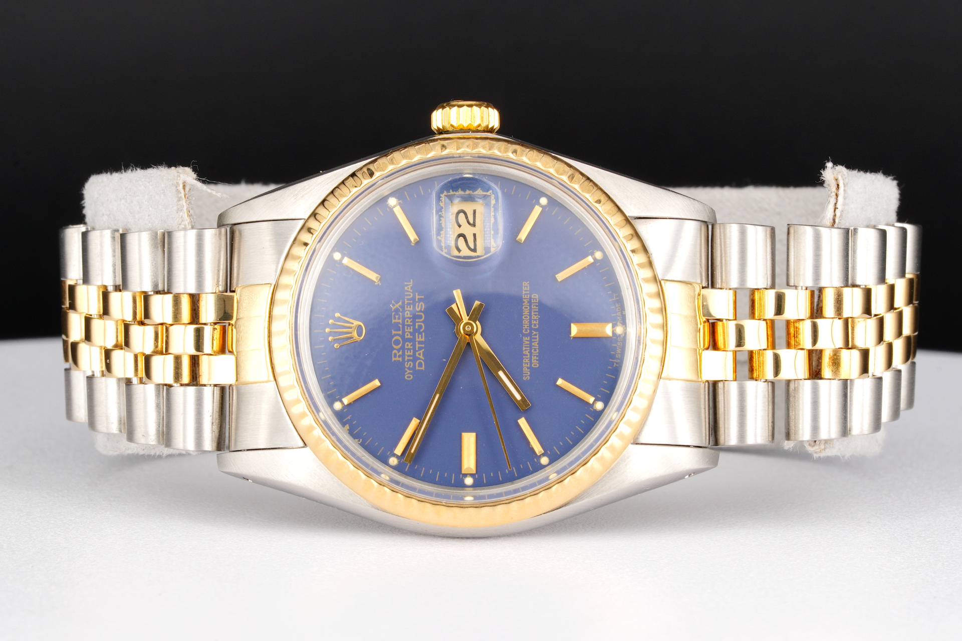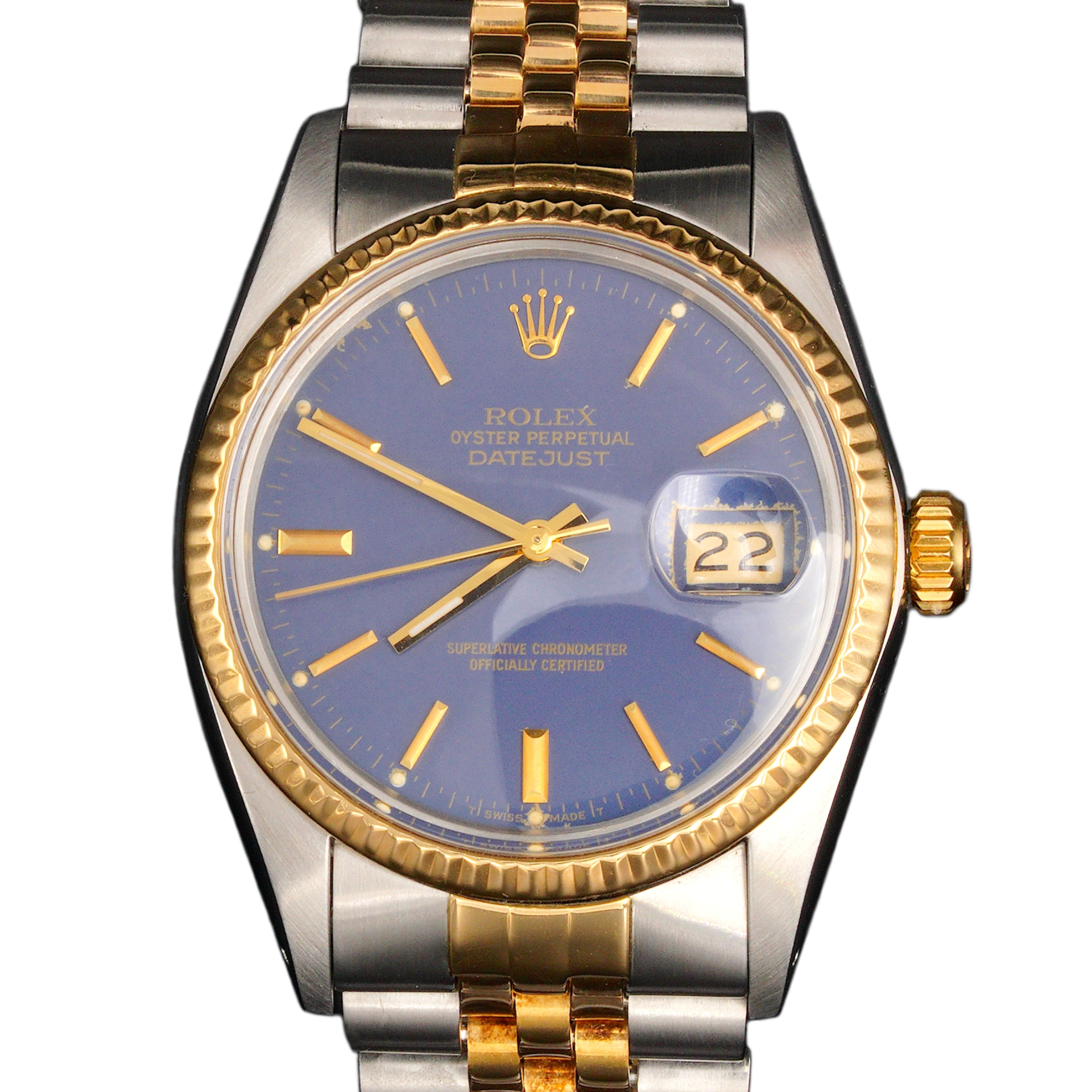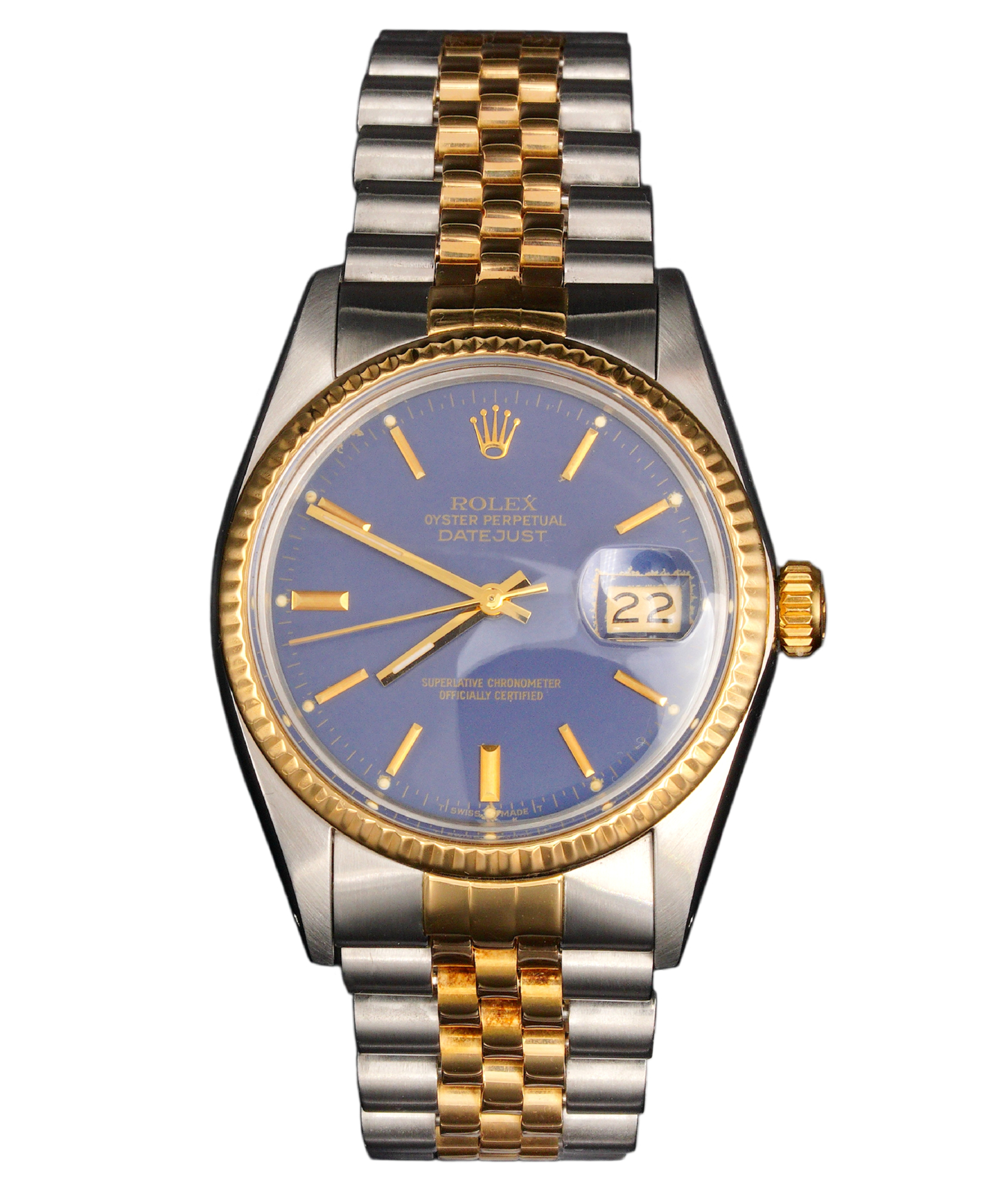 BeckerTime is proud to offer this Men’s 36mm Rolex 2Tone Yellow Gold and Stainless Steel Datejust Watch model ref #16013 with a blue lavender dial. This Rolex is the QUICKSET MODEL with a Rolex Jubilee band.