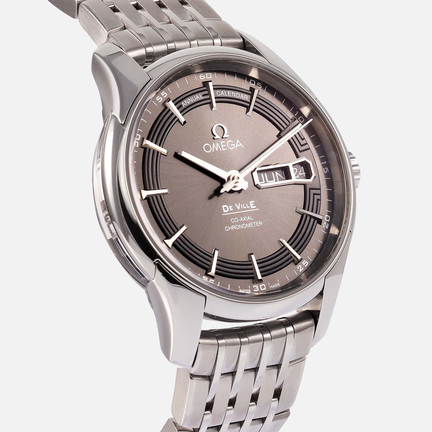 Crafted with precision, the stainless steel case of this Omega De Ville Hour Vision houses a captivating grey dial adorned with index markers, offering a sophisticated appeal suitable for any occasion.