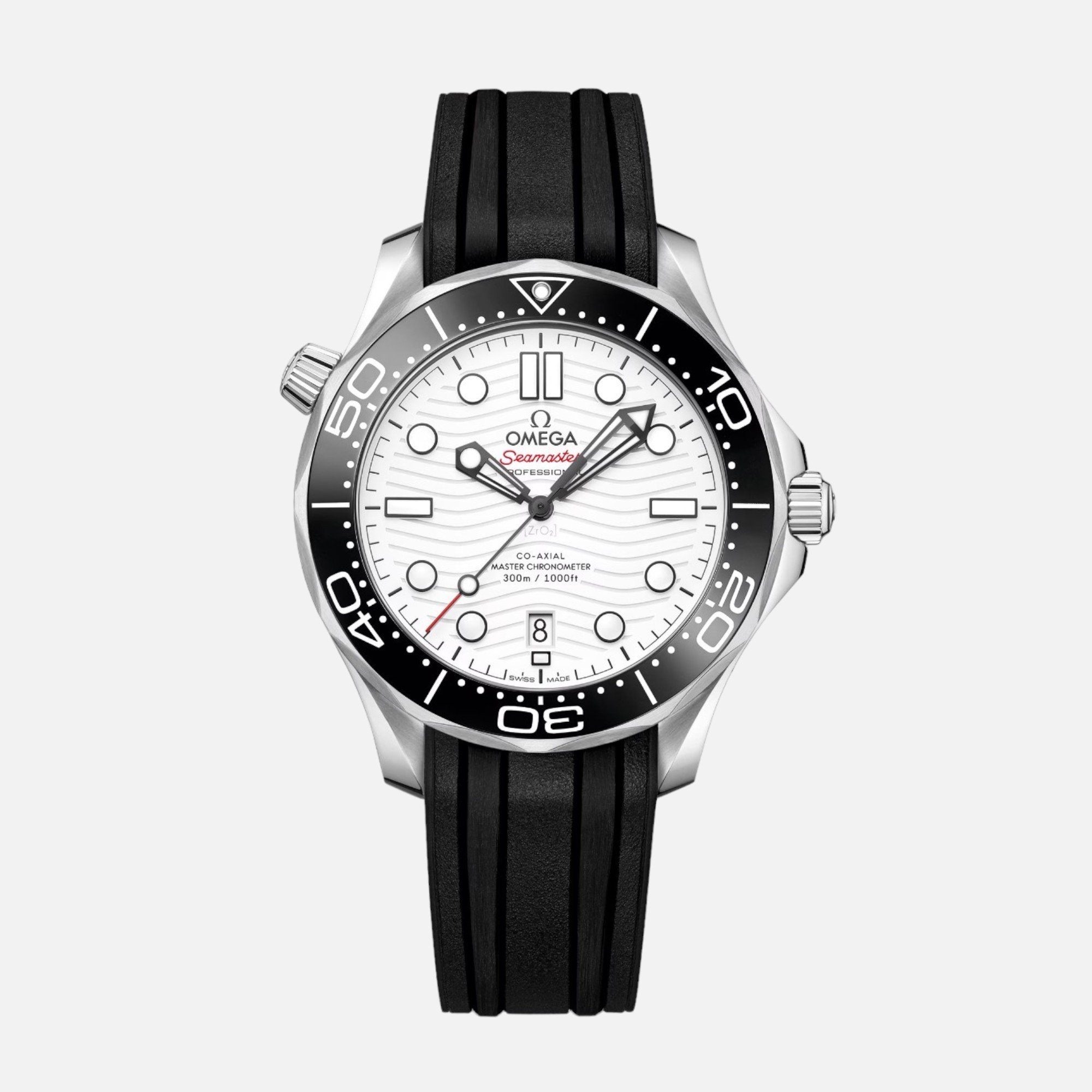 This 42 mm model is crafted from stainless steel and includes a black ceramic bezel with a white enamel diving scale. The dial is polished white ceramic and features laser-engraved waves and Seamaster highlighted in red.