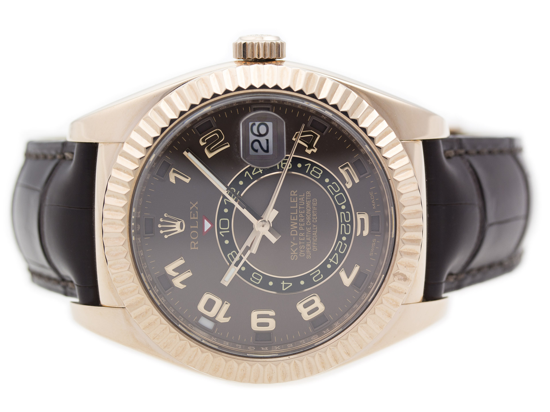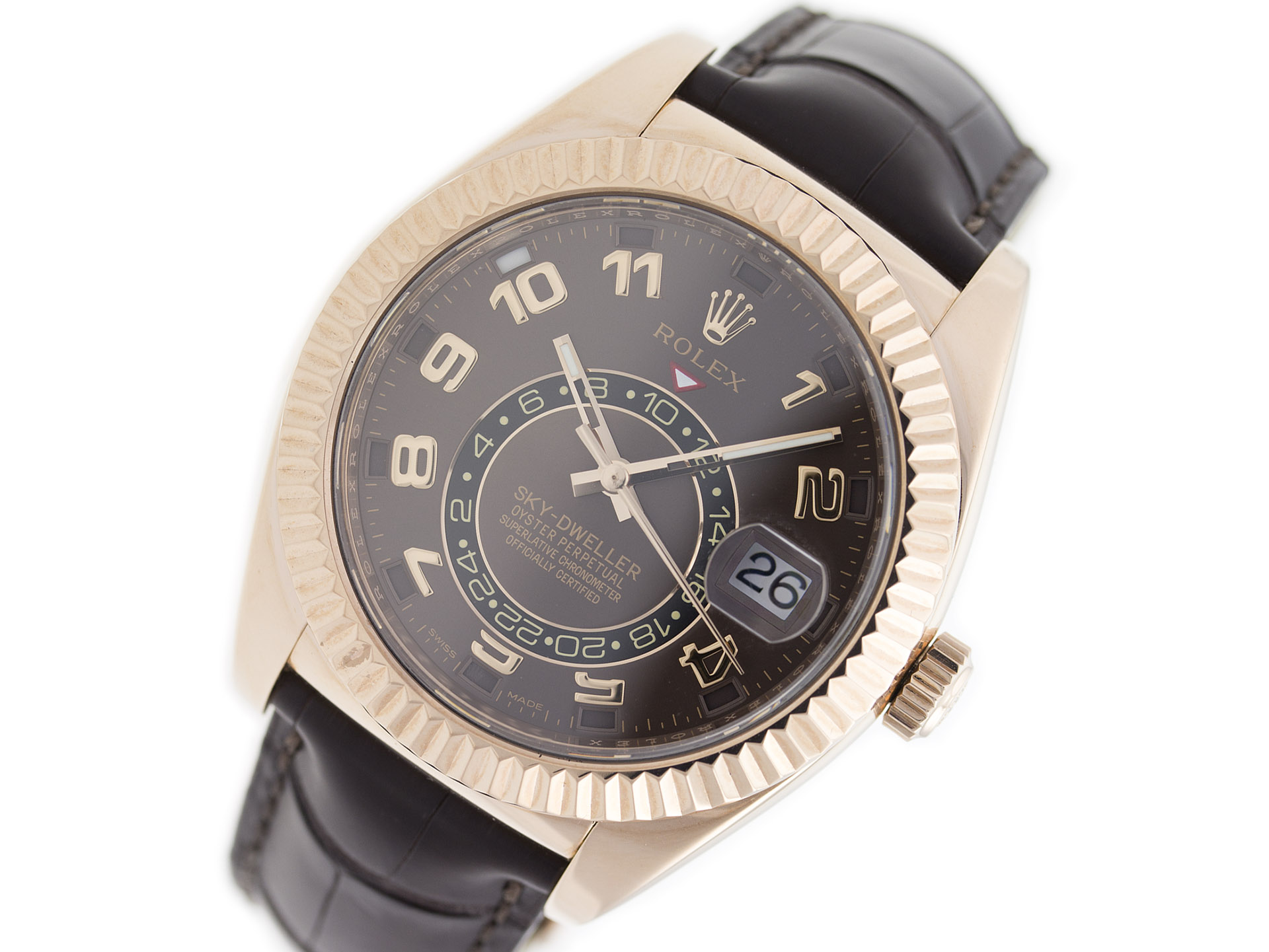 Crown: Screw Down   Key Features: 18K Gold, Rolex, SkyDweller, Chocolate, Rose Gold, Leather