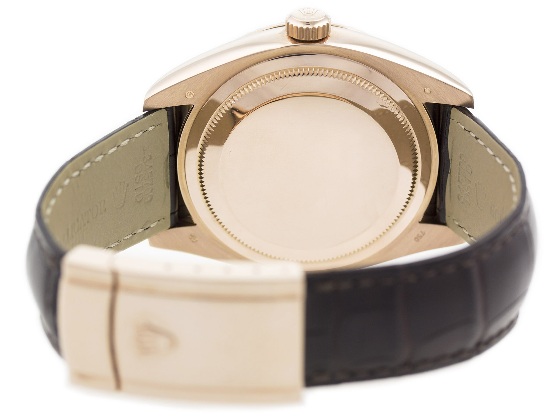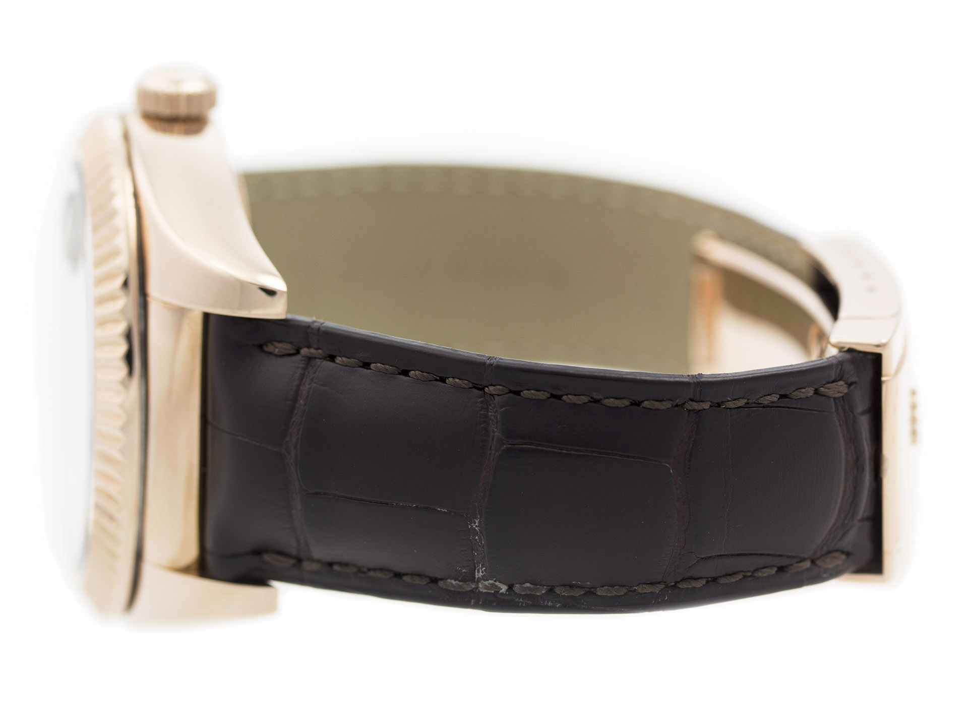 Material: 18K Rose Gold   Band: Brown Alligator Leather Strap