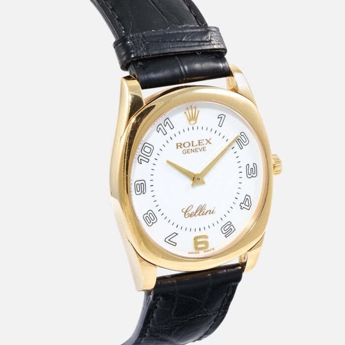 Experience the ultimate in luxury and elegance with the Rolex Cellini 4233/8. With an 18K yellow gold case, black leather strap, and fixed bezel, this watch is a timeless classic. The white dial with Arabic numerals is both stylish and easy to read. The manual winding movement and solid caseback provide reliable performance, while the 100m/330ft water resistance ensures versatility.