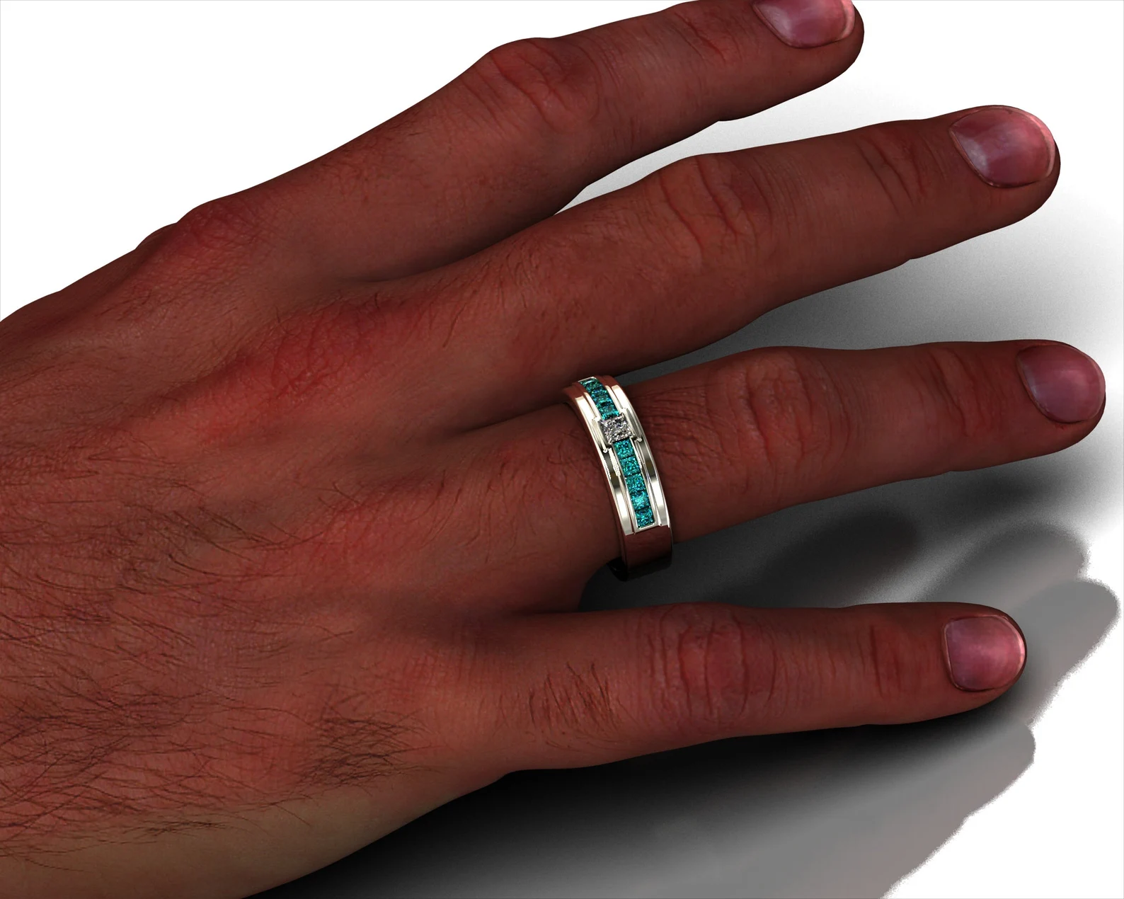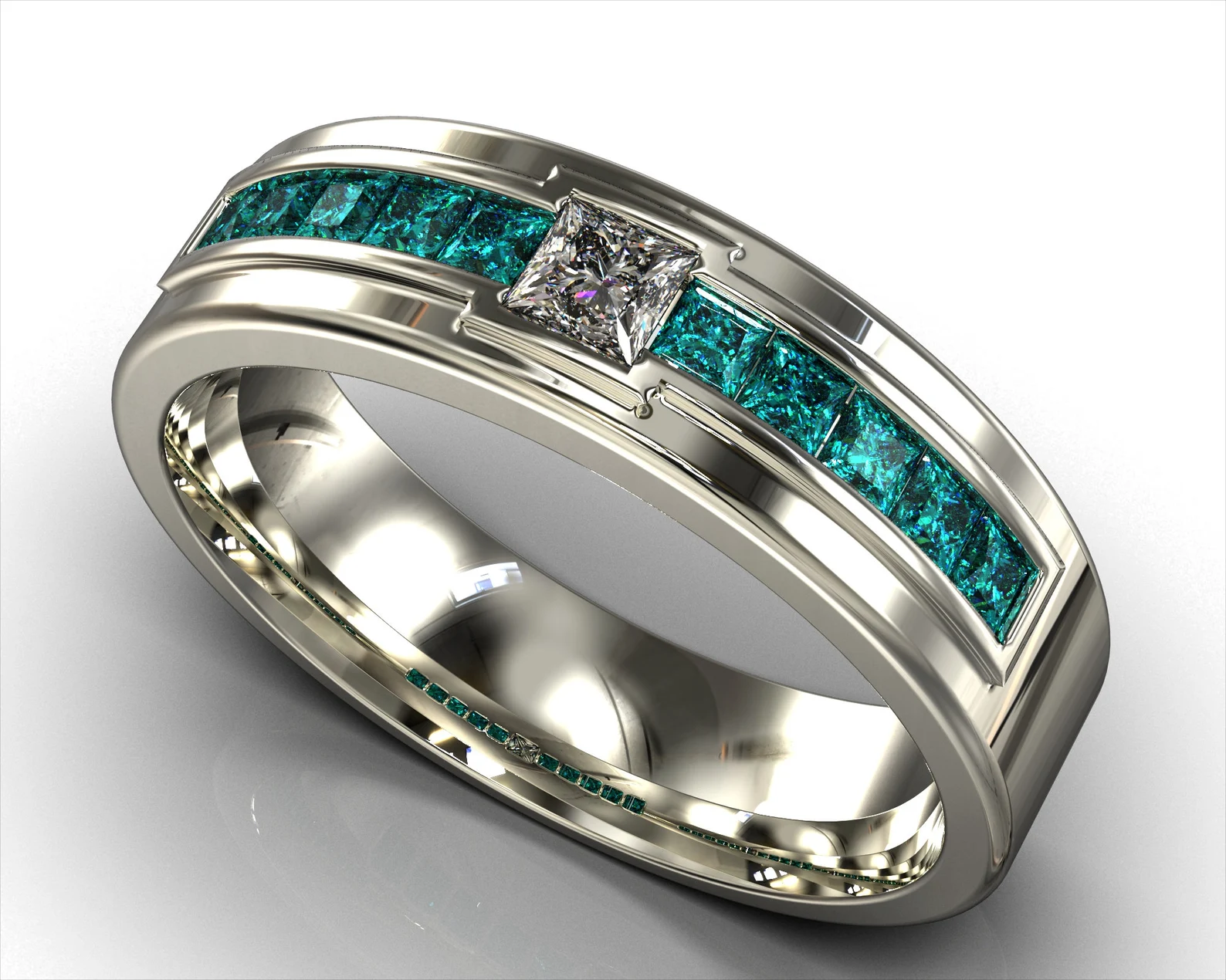 This beautiful wedding band features both a stunning clear diamond and beautiful blue diamonds set in a belt channel bezel in sheer white gold, making an amazing ring for a stylish man.