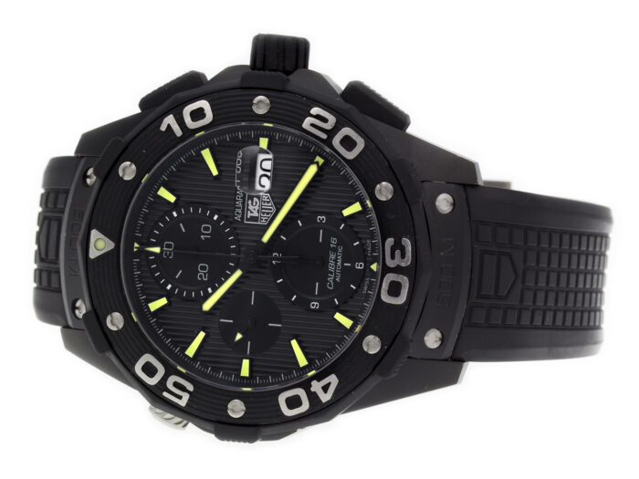 Black PVD Tag Heuer Aquaracer CAJ2180.FT6023 watch, water resistant to 500m, with chronograph, date, and rubber strap.